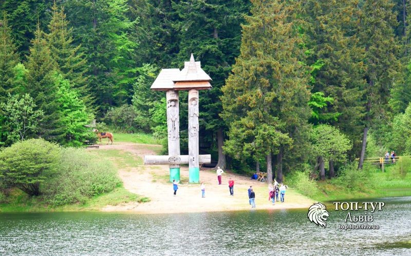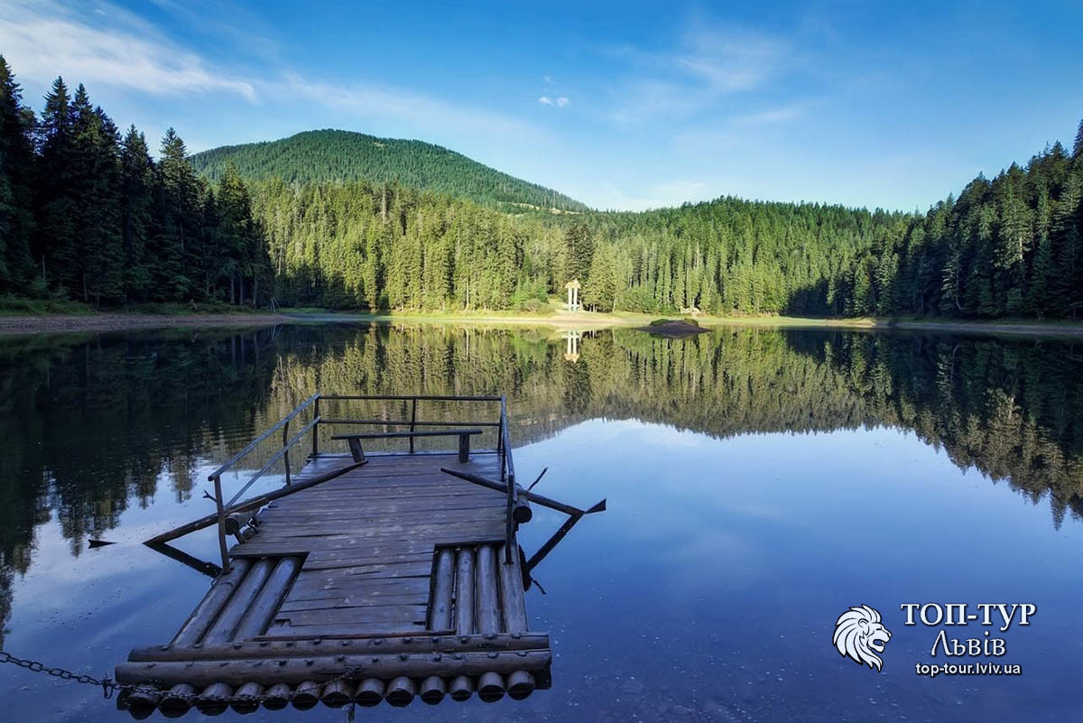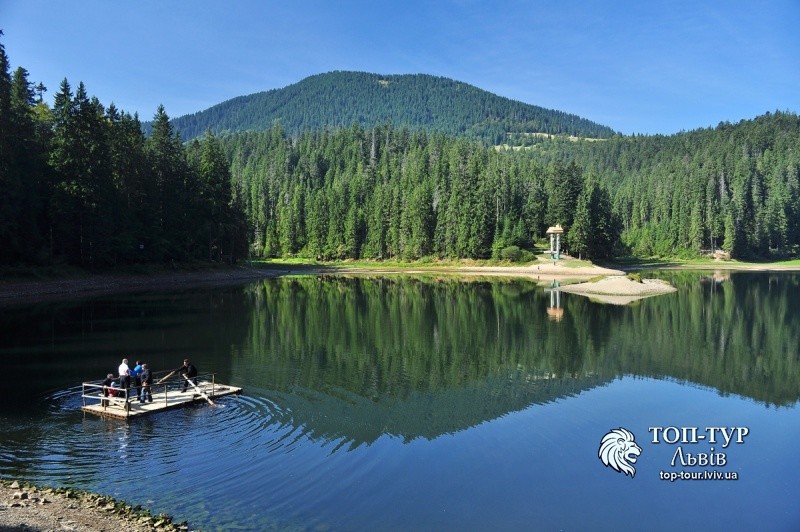 Посеред водойми розташований невеликий острівець, туди, за символічну плату ми дісталися за допомогою дерев’яного плота. Варто згадати, що плавання та риболовля тут заборонені, ці заходи просто необхідні для зберігання відмінної чистоти озера. Дещо ж пізніше, ми здійснили невеличку екскурсію навколо Синевиру, але вже верхом на коні (до речі, тут пропонуються і велопрогулянки).